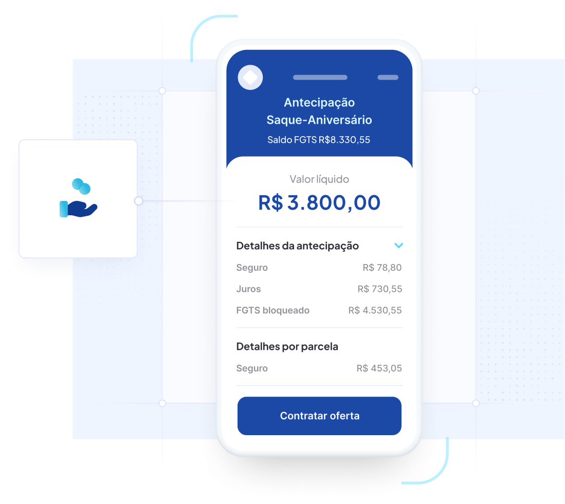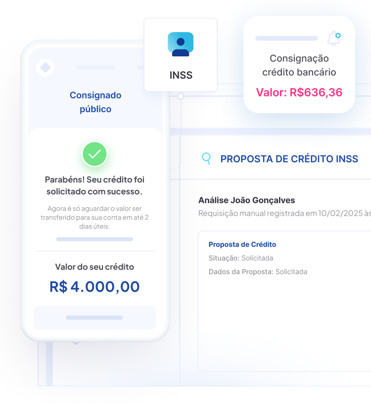 Infraestrutura tecnológica e regulatória para correspondentes bancários. Disponibilize crédito consignado para seus clientes com convênios como INSS, FGTS, SIAPE, Exército, Marinha, Aeronáutica, cartão benefício e consignado privado, com uma esteira completa de venda, formalização, bancarização e cessão do crédito.